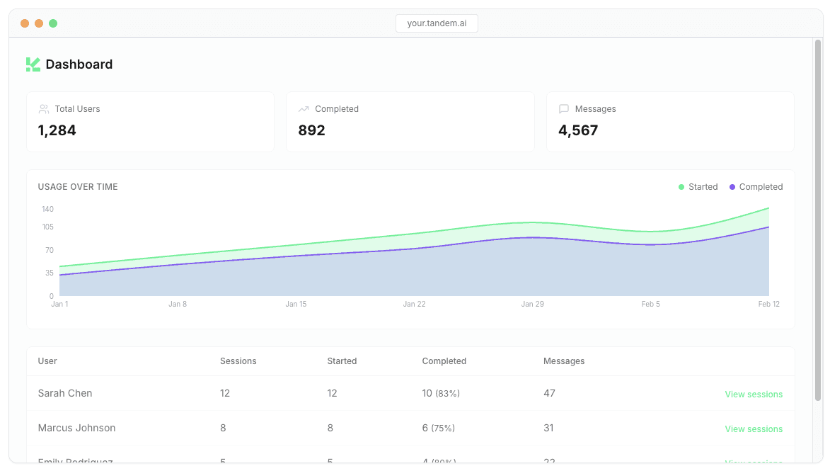 We never store your users' data. Agents work in real-time on the client side. You can configure Tandem to ignore specific sensitive fields (SSN, credit cards, etc). SOC2 Type II compliant.